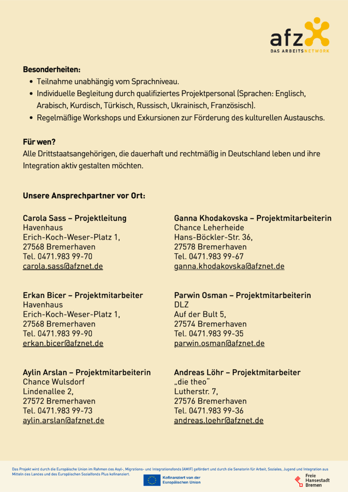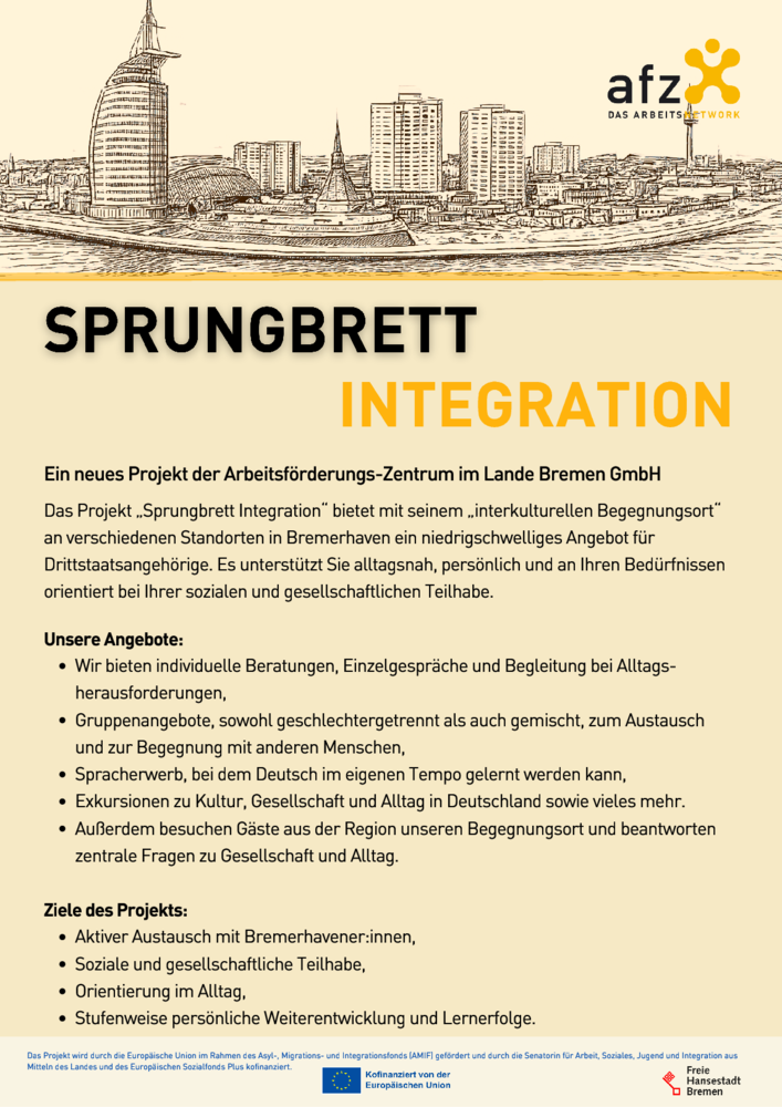 Das Projekt „Sprungbrett Integration“ der Arbeitsförderungs-Zentrum im Lande Bremen GmbH bietet mit seinem „Interkulturellen Begegnungsort“ an verschiedenen Standorten in Bremerhaven ein niedrigschwelliges Angebot für Drittstaatsangehörige. Es unterstützt Sie alltagsnah, persönlich und an Ihren Bedürfnissen orientiert bei Ihrer sozialen und gesellschaftlichen Teilhabe.