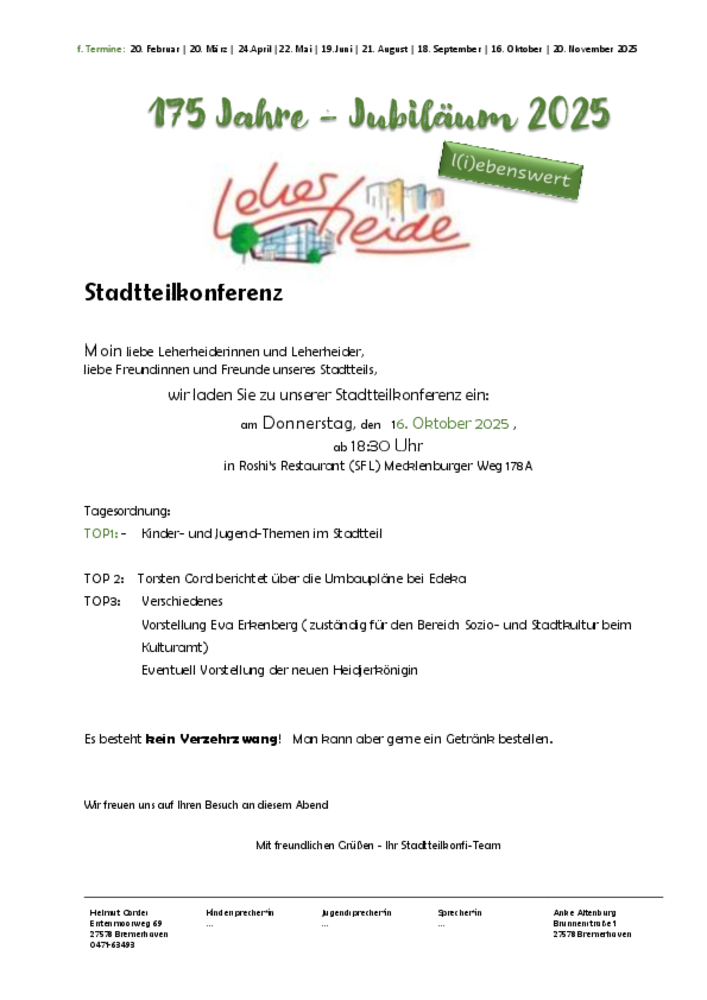 Moin liebe Leherheiderinnen und Leherheider, liebe Freundinnen und Freunde unseres Stadtteils,