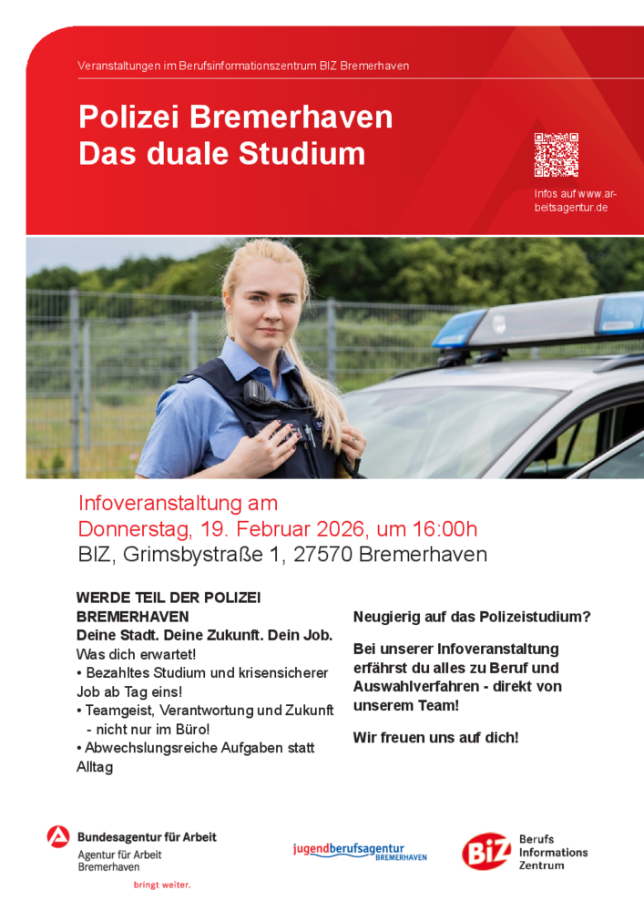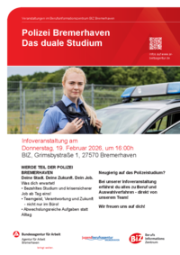 Die Polizei Bremerhaven gibt Einblicke in den Polizeiberuf und informiert über das duale Studium. Themen sind unter anderem die Aufgaben im Polizeialltag, die Zugangsvoraussetzungen sowie das Bewerbungs- und Auswahlverfahren.