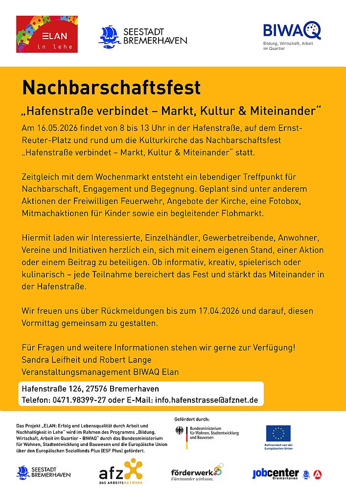 Hiermit laden wir Interessierte, Einzelhändler, Gewerbetreibende, Anwohner, Vereine und Initiativen herzlich ein, sich mit einem eigenen Stand, einer Aktion oder einem Beitrag zu beteiligen. Ob informativ, kreativ, spielerisch oder kulinarisch - jede Teilnahme bereichert das Fest und stärkt das Miteinander in der Hafenstraße.