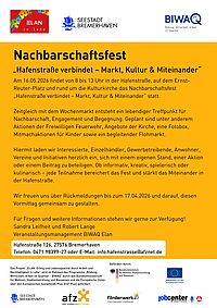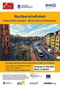Am 16.05.2026 findet von 8 bis 13 Uhr in der Hafenstraße, auf dem Ernst-Reuter-Platz und rund um die Kulturkirche das Nachbarschaftsfest "Hafenstraße verbindet - Markt, Kultur & Miteinander" statt.